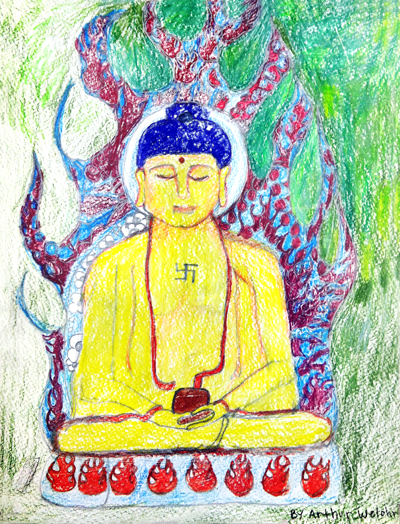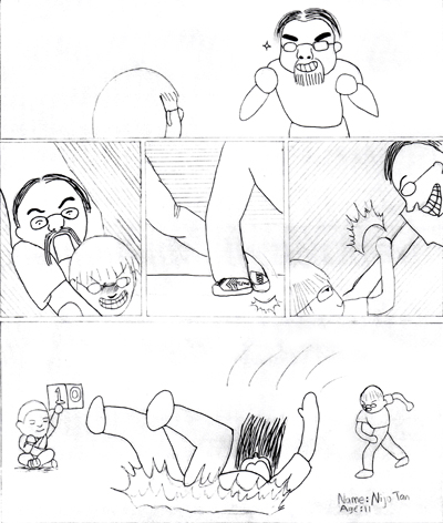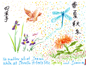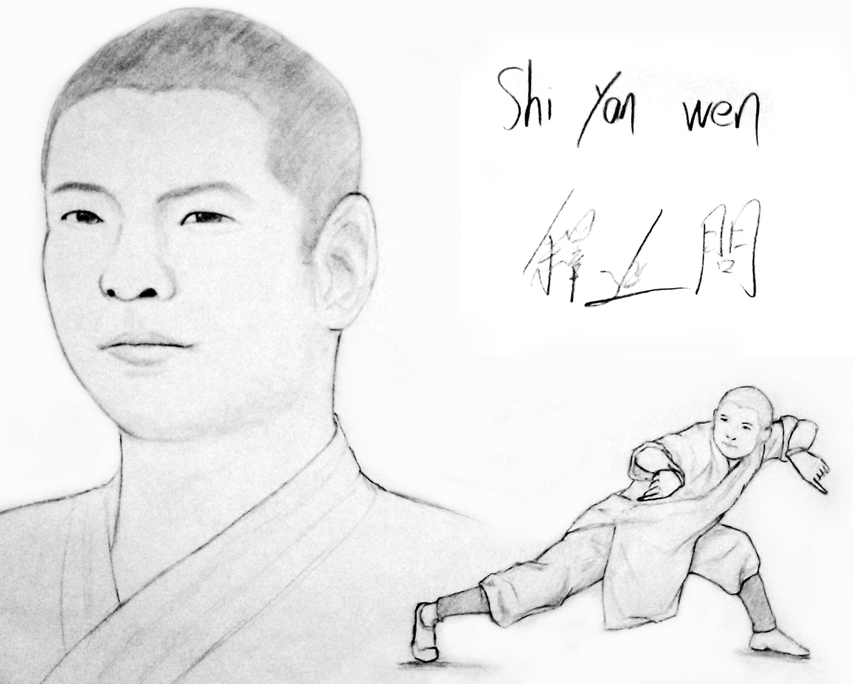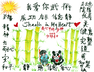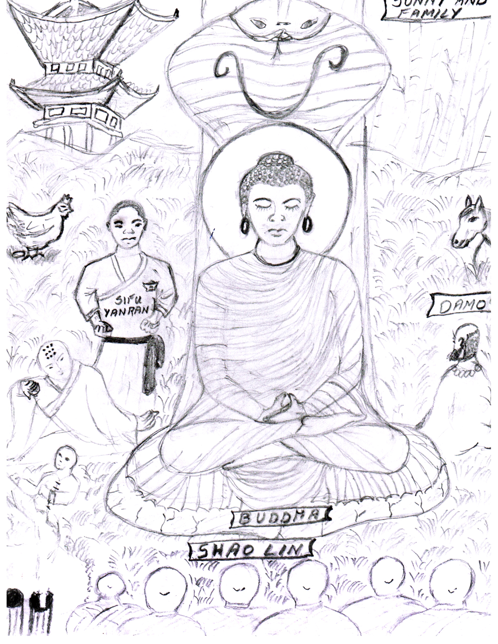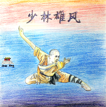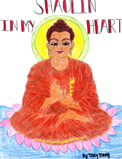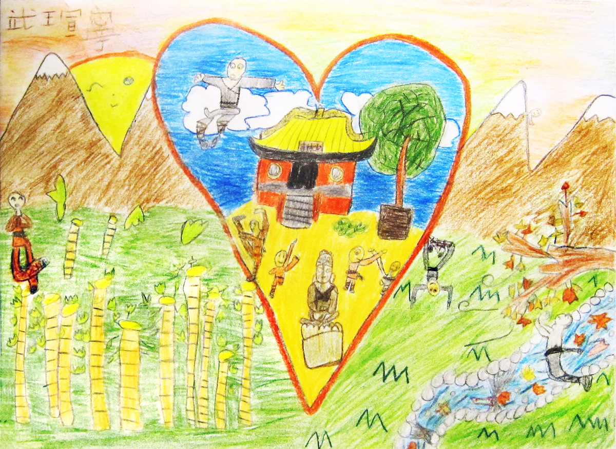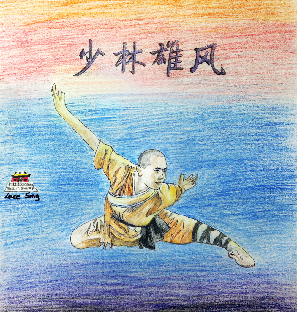 Cynthia’s drawing depicts Shaolin masters’ diligent Kung Fu training in the deep forest and Chan cultivation at Shaolin Temple. She was inspired by her Sifu’s teachings of discipline and diligence in learning Shaolin Kung Fu.